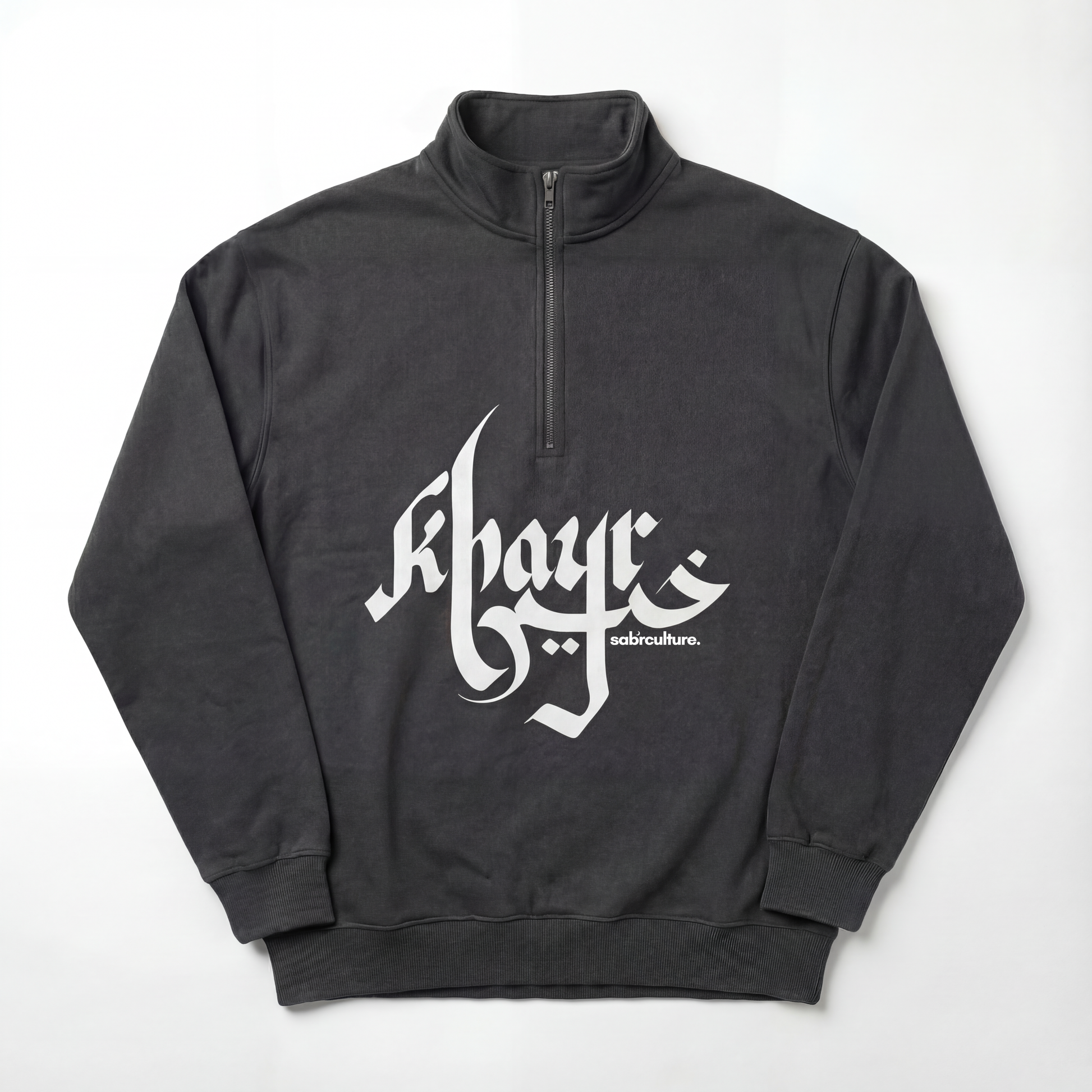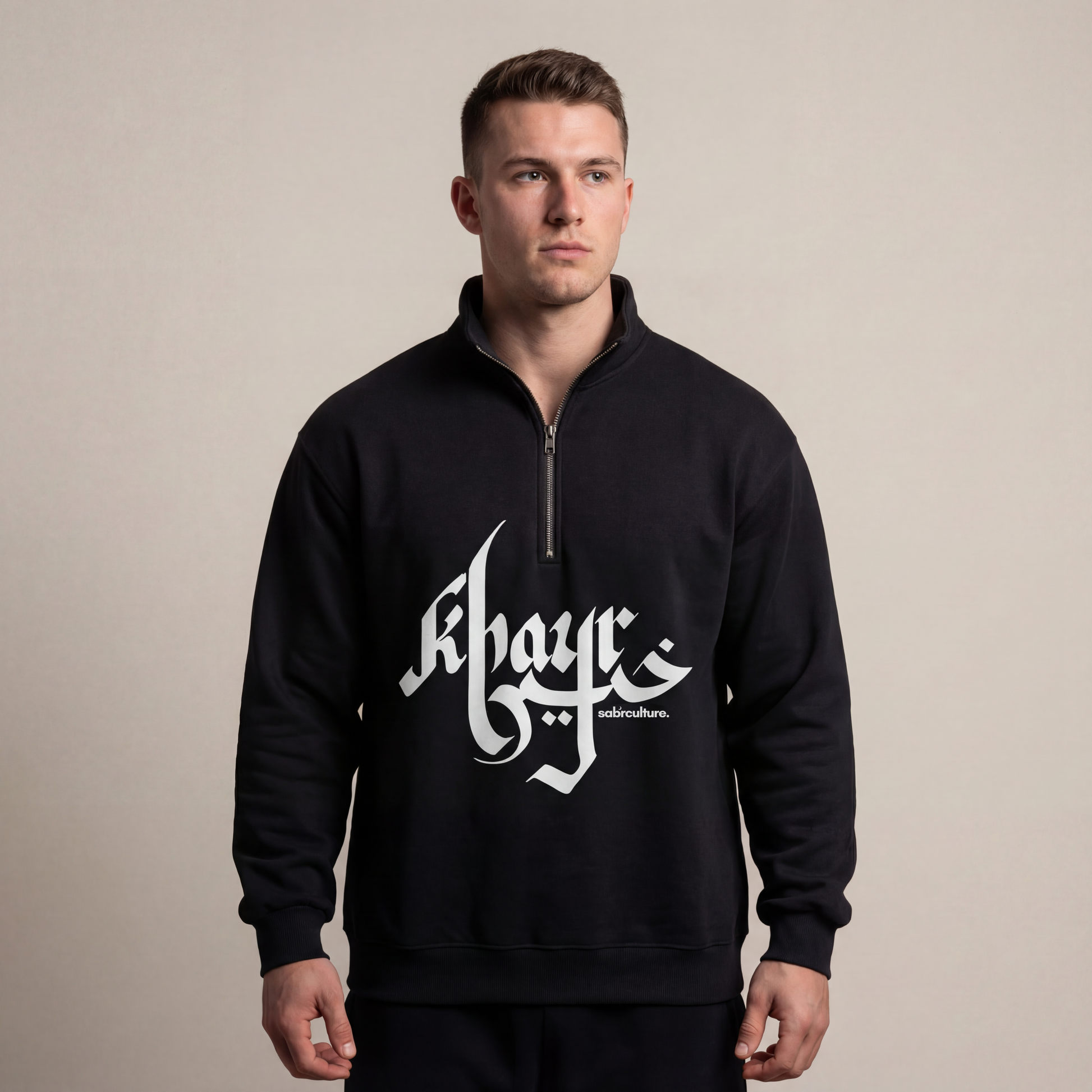 Elevate your everyday wardrobe with a piece that perfectly balances modest streetwear with a constant reminder of blessings. This premium quarter zip is crafted from a heavyweight 320 GSM fleece blend, offering substantial warmth and a structured fit that looks great on both men and women. Featuring striking "Khayr" calligraphy which intricately interweaves sharp, gothic-inspired English lettering with the fluid forms of the original Arabic script (خير) to create a single, dynamic piece of art, this sweatshirt isn't just about comfort; it is a wearable affirmation of goodness designed to last through the seasons.